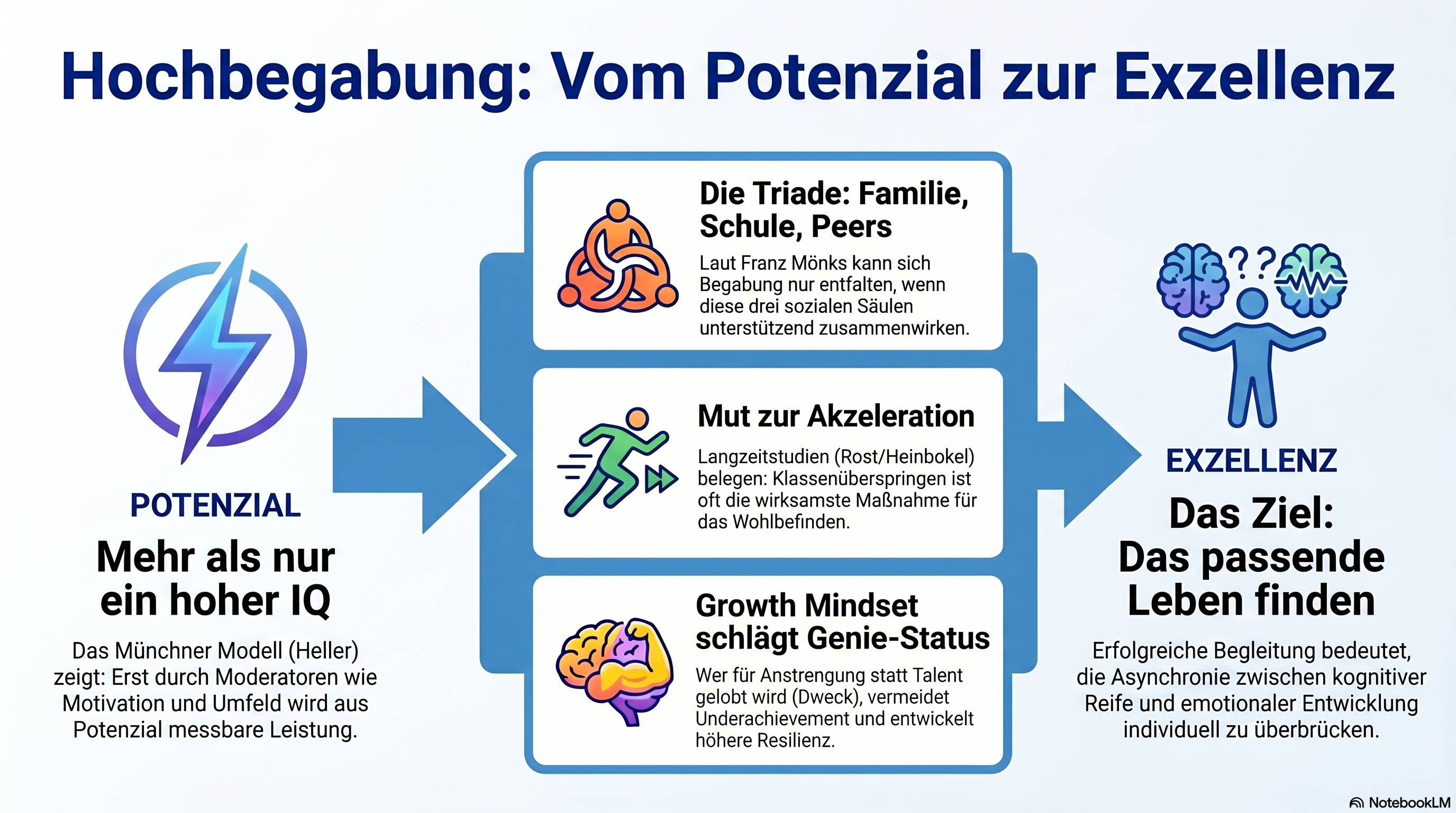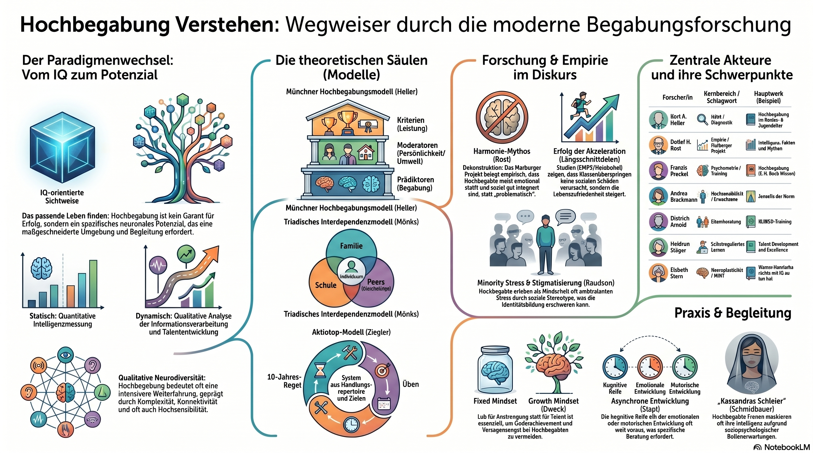 Hellers Hochbegabungsmodell verbindet Begabungsfaktoren, Persönlichkeit und Umwelt als Moderatoren. Die Münchner Testbatterie (MHBT) ist diagnostischer Standard.